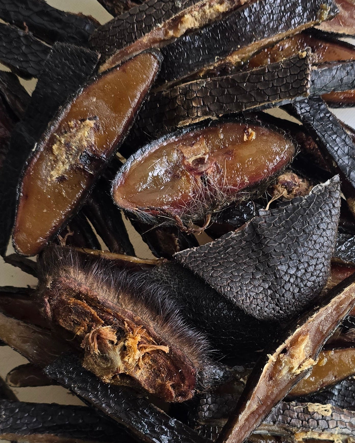 Chewy and leathery texture. Contains bones that are safe to consume under supervision.