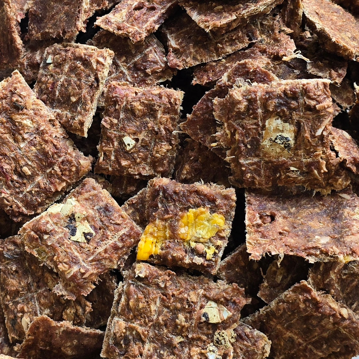 Gently dehydrated at a low temperature to preserve its nutrients and unique, drool-worthy flavours.